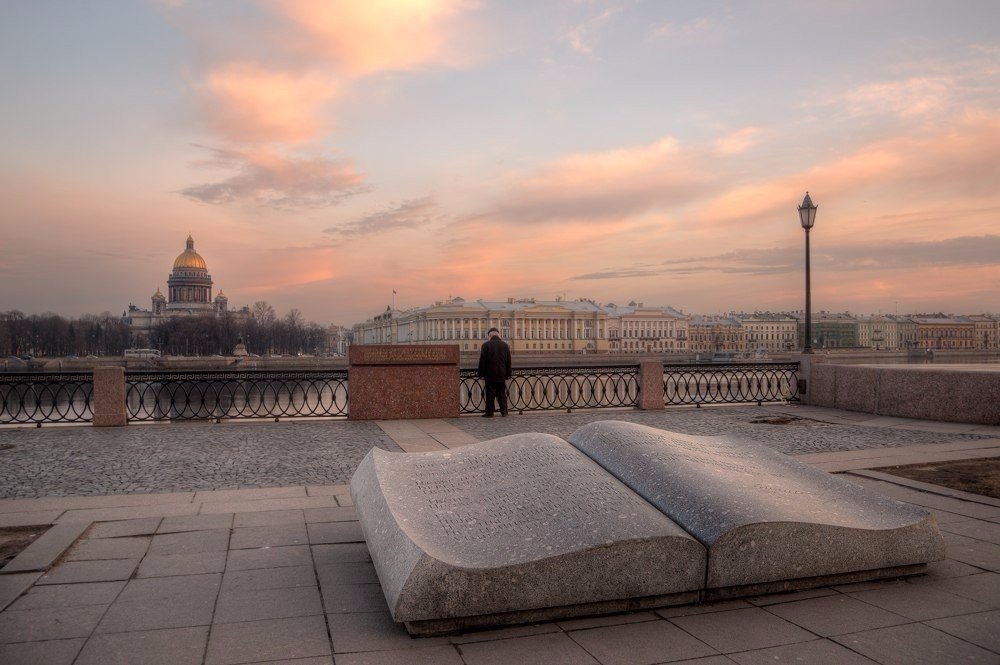 Памятник был установлен в канун празднования 300-летнего юбилея города в 2002 году. На страницах книги выбит фрагмент поэмы А. С. Пушкина «Медный всадник»: Люблю тебя, Петра творенье, а в конце отрывка можно увидеть автограф поэта.